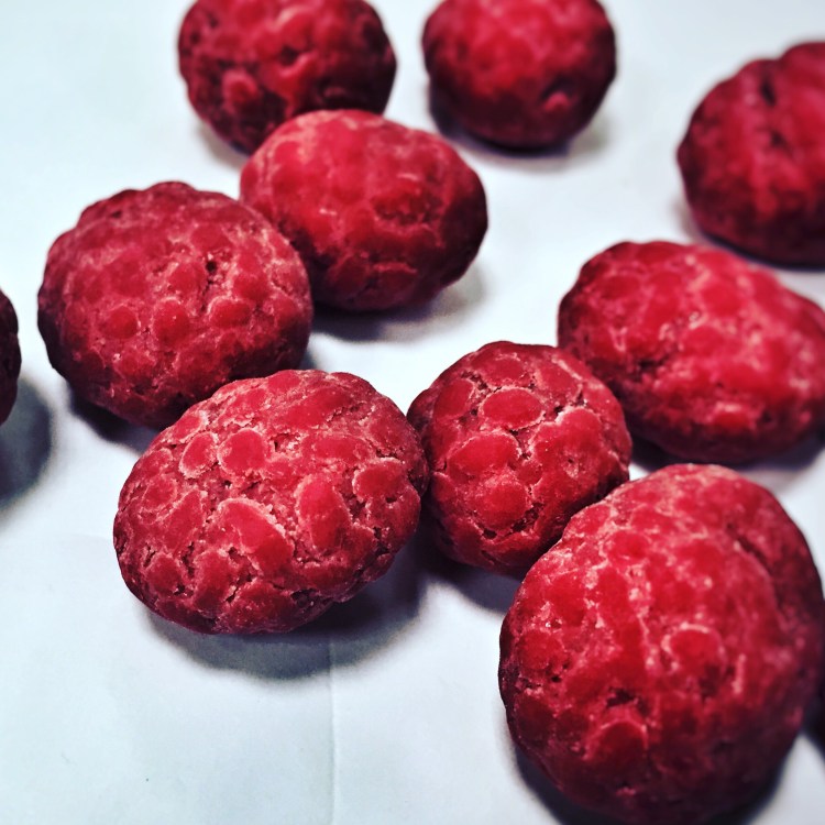 In questo caso , sono partito dai Cranberry ( Mirtillo rosso) e sono stati ricoperti da Cioccolato Bianco , ottenendo attraverso la lavorazione l’effetto LITCHI detto anche “Ciliegia della Cina “