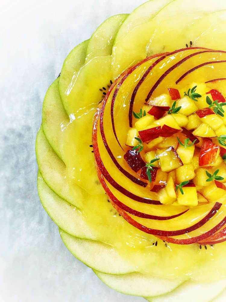 Adoro la combinazione pesca e timo e per dare ancora più carattere al tutto, la gelatina per lucidare è aromatizzata al timo.