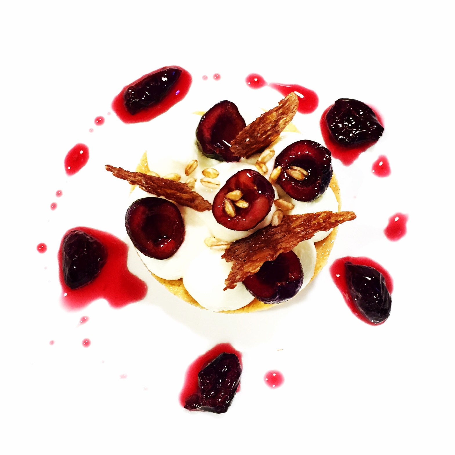 • ricotta di Pecora • Ciliege semicandite • farro candito • frolla al farro • croccante di farro • biscotto al limone