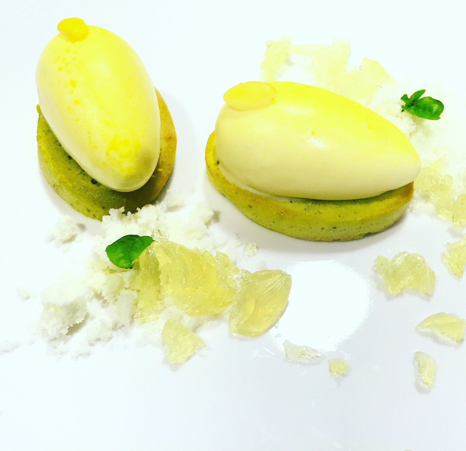 Un dessert fresco, profumato e mediterraneo. • mousse leggera al limone • copertura di cioccolato bianco •biscotto morbido ALL’OLIO e basilico • polvere ALL’OLIO di bergamotto • gelatina di limone