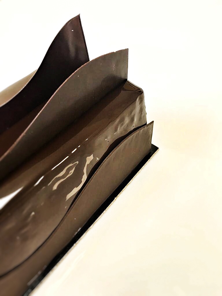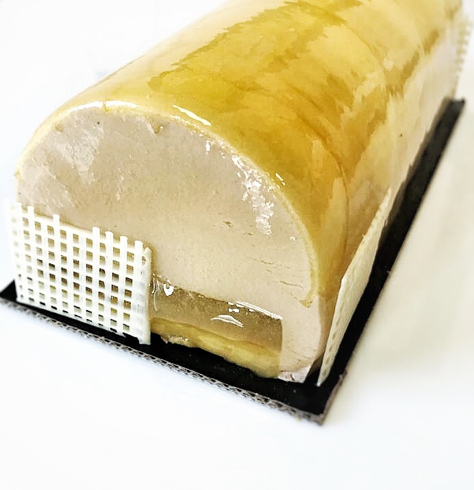 Un cake dal gusto molto intenso . Un impasto con Belcolade Vietnam 73, che conferisce al dolce una nota fondente con una spiccata acidità agrumata . Nello stesso impasto c’è il 18% di nocciole tostate e caramellate e ricoperto con glassa Rocher fondente e nocciole.