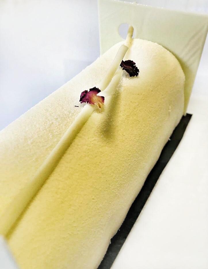 FIOCCO DI NEVE • cake alla mandorla • Praliné Amande 50% • inserto di Amarena e Anice stellato • mousse Blanc Intense e Mascarpone FIOCCO DI NEVE • almond cake • PatisFrance Praliné Amande 50% • black cherry and Anis filling • Belcolade Blanc Intense and Mascarpone mousse